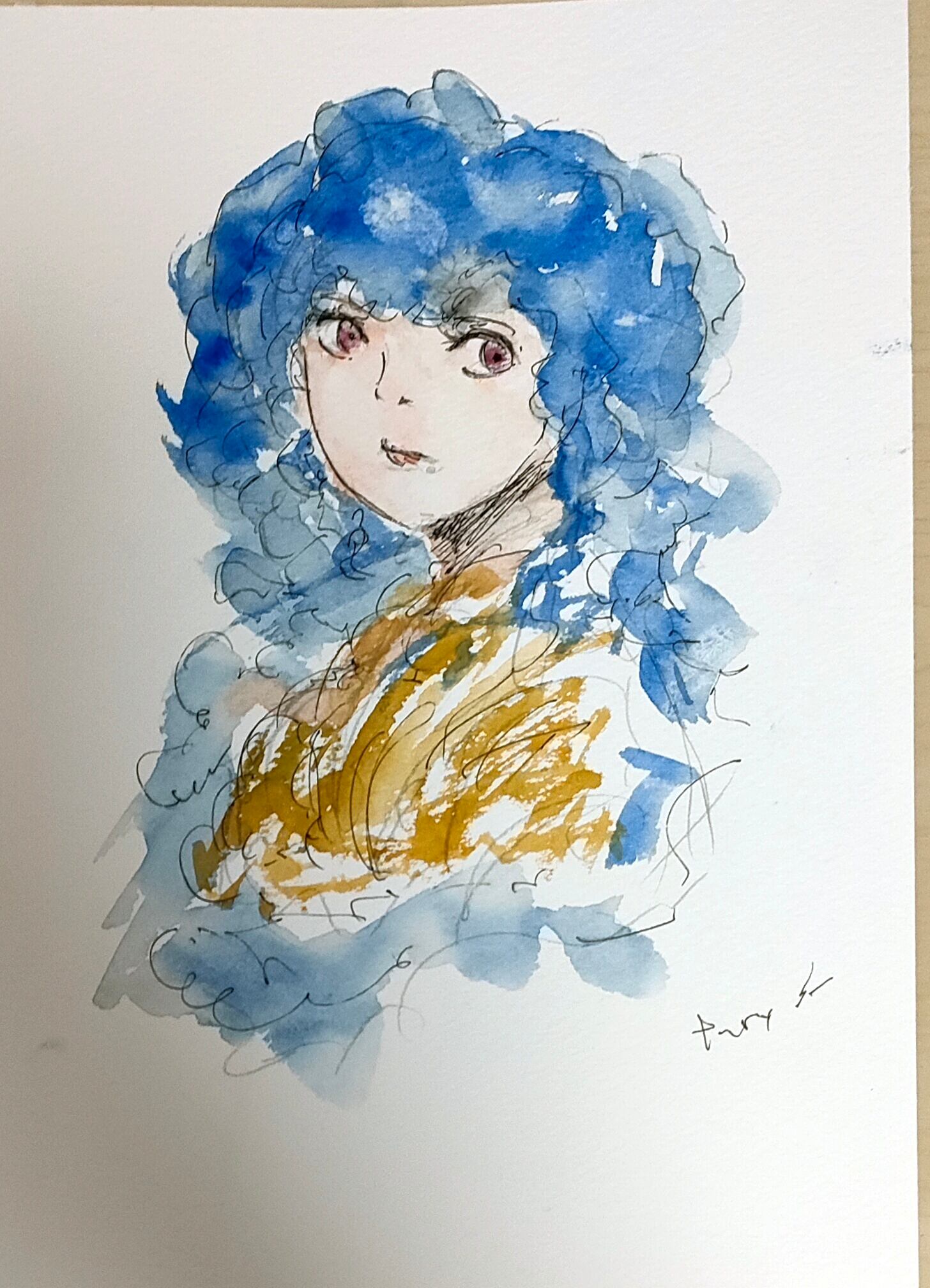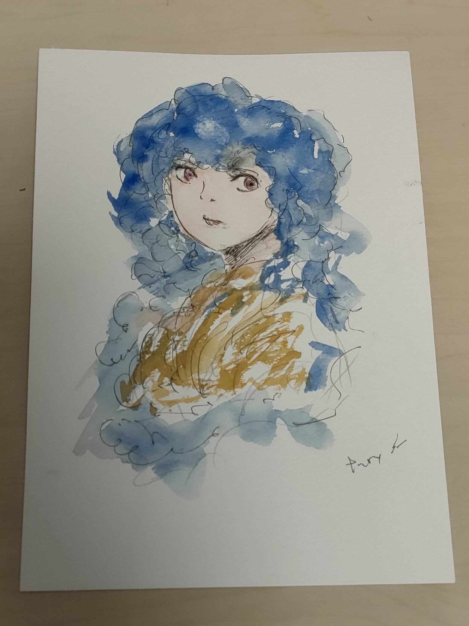 青髪の女の子がキャンバスに舞い降りる、魅力あふれる原画「ドローイング ペン&水彩画」です。SMサイズ(227×158mm)のこの作品は、独特のペン描写と柔らかな水彩の技法が見事に融合し、彼女の世界観を鮮やかに表現します。