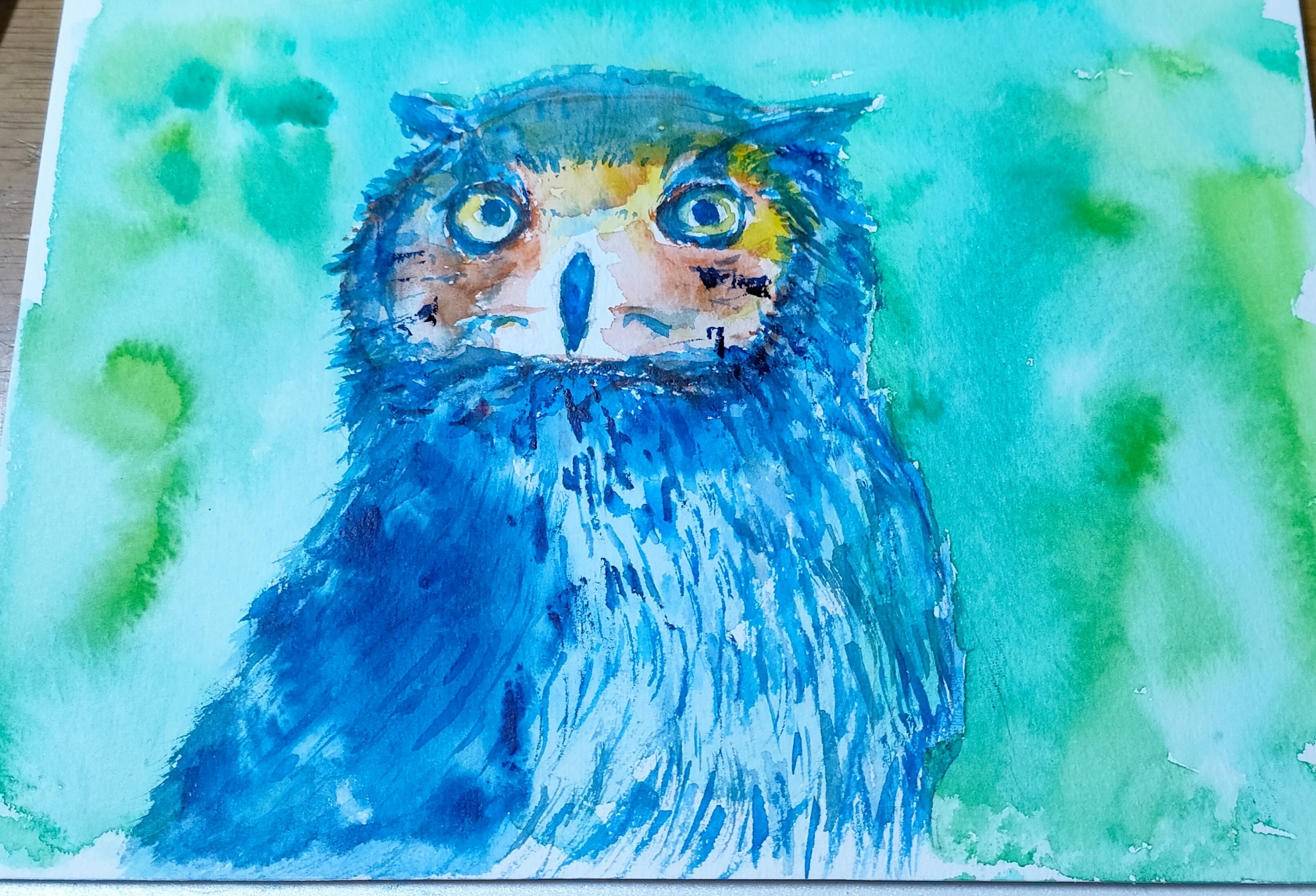 水彩画で表現された、愛らしい「ふくろう」がテーマの作品です。SMサイズ(227×158mm)のこのアートは、ホワイトワトソン紙にホルベイン水彩絵の具を使用し、柔らかくも豊かな色彩でその魅力を引き出しています。