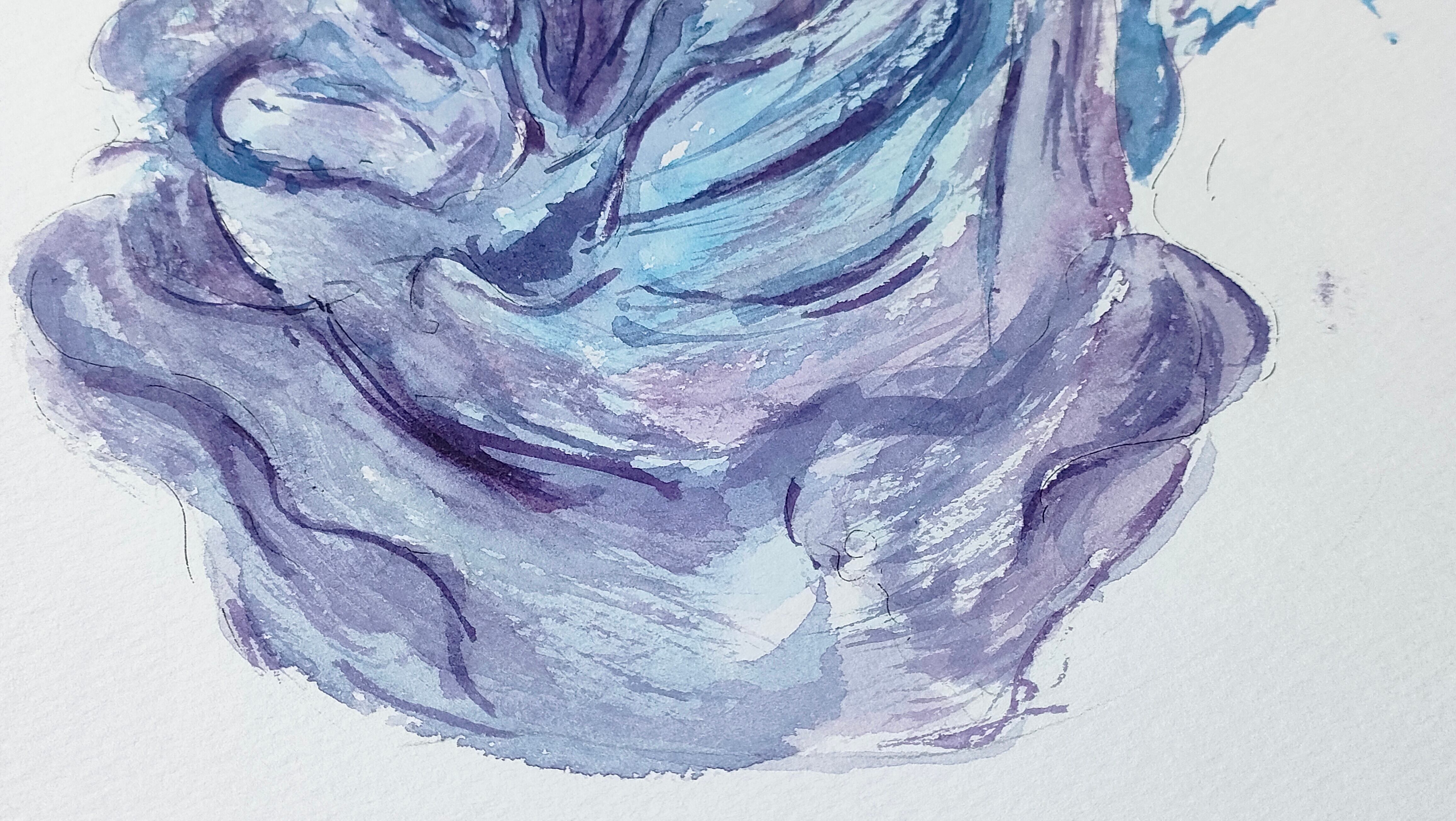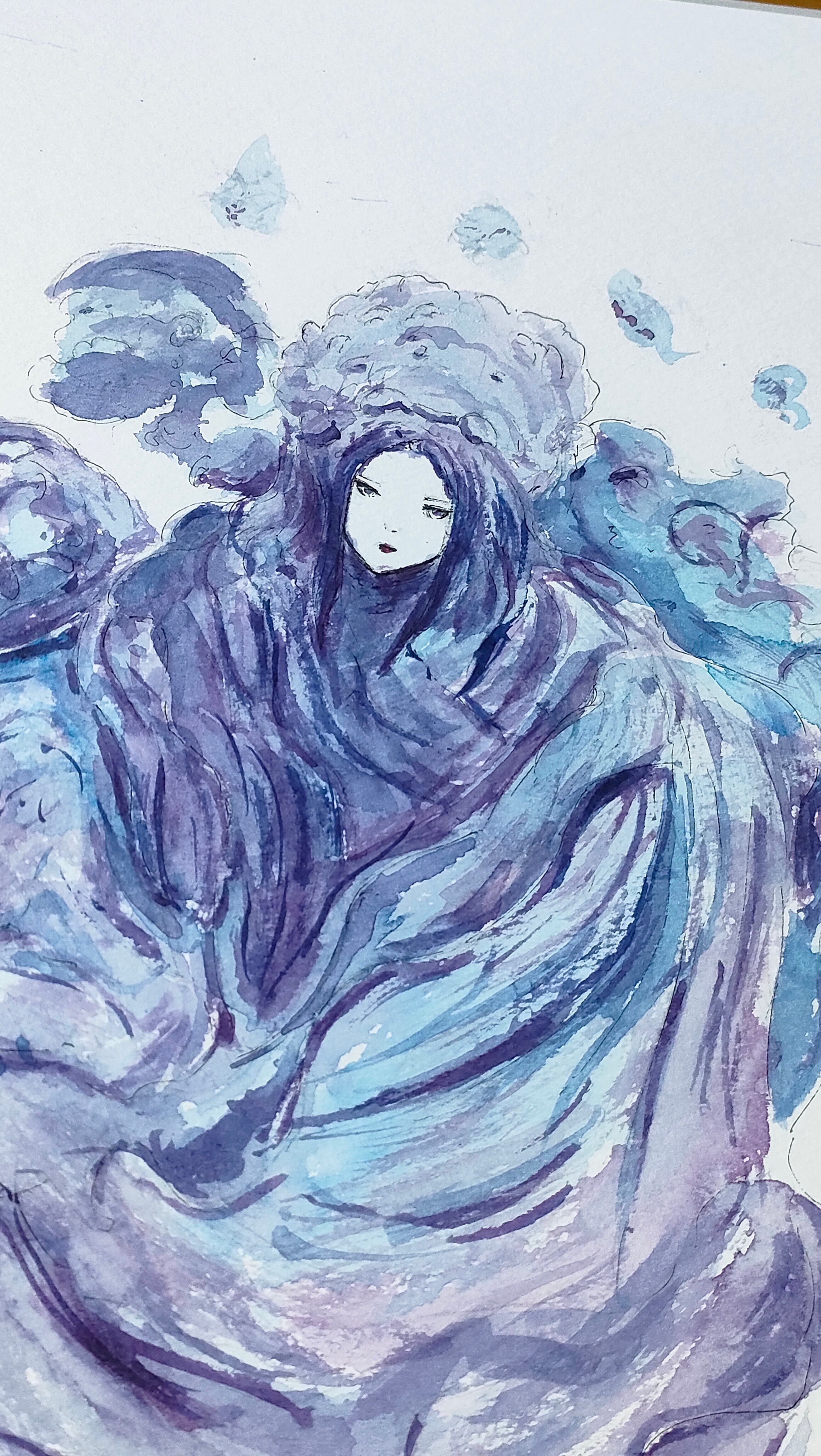 水と霧が混ざり合うような紫と青のレイヤーで、神秘的な魔女を描いた一点物の原画作品です。