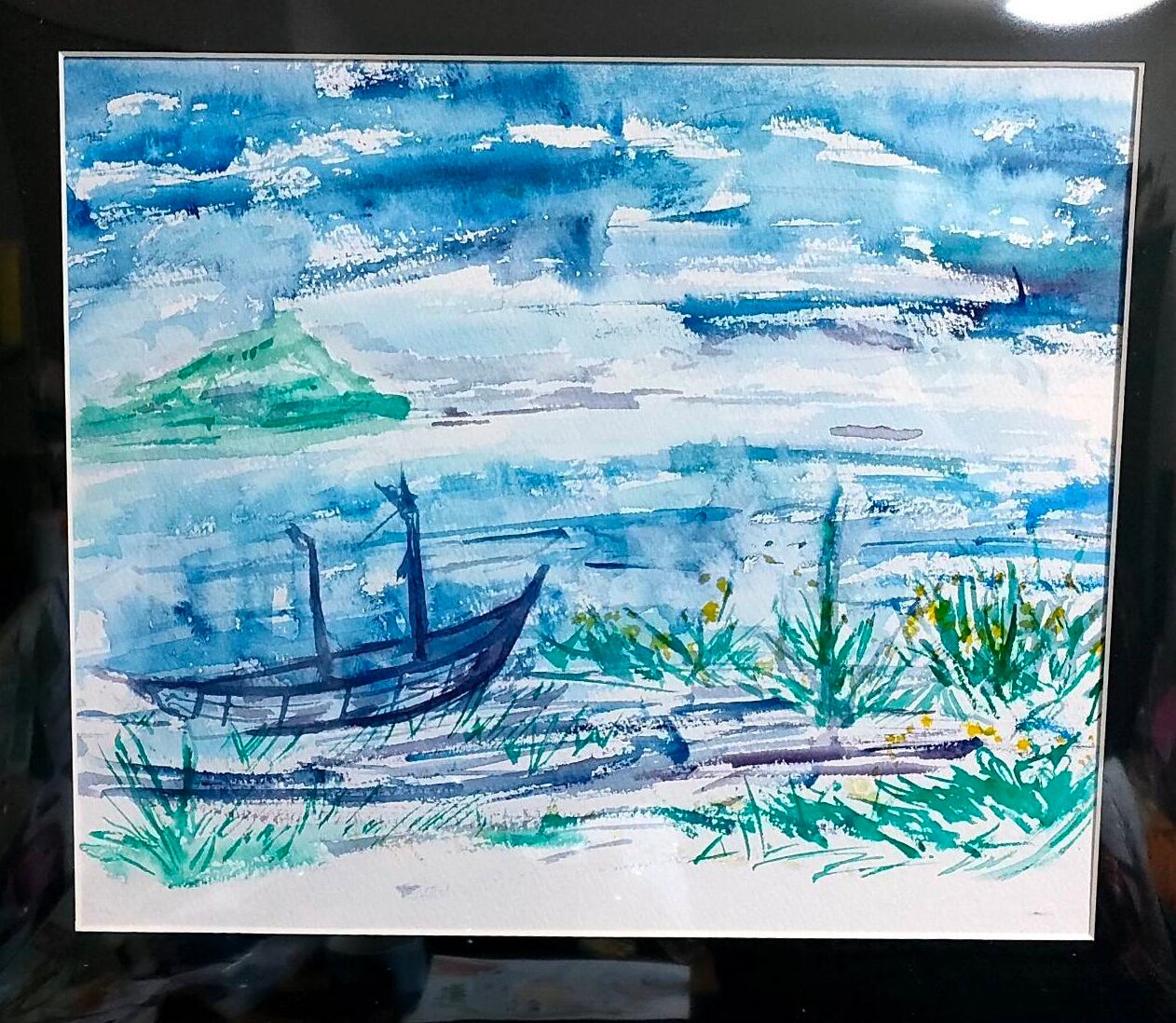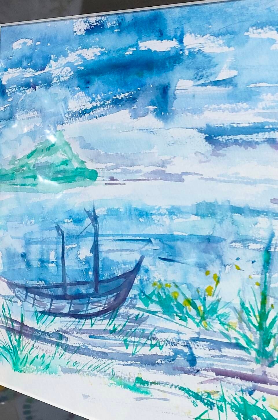Layering the depth of blue and the flickering of light, the painting depicts a serene moment, centered around a small boat gently floating.