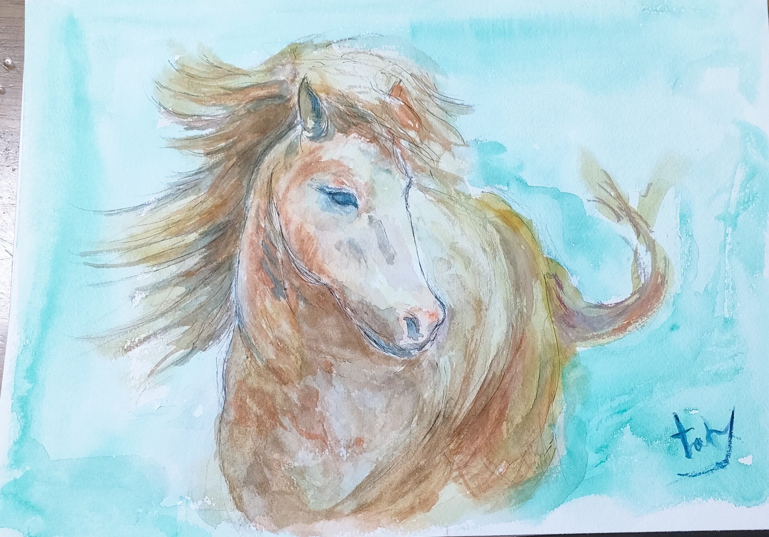 静かに佇みながらも、確かに風を感じさせる馬の姿を描きました。