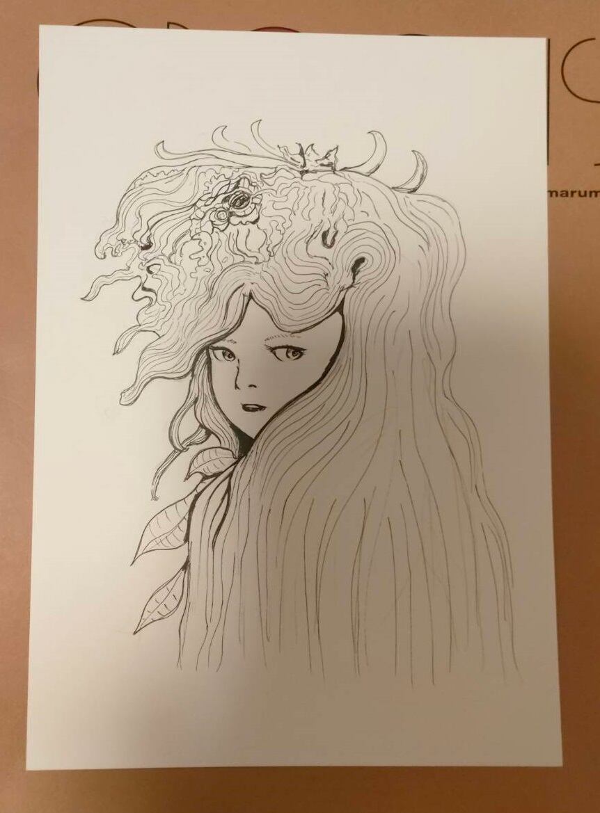線の美しさが際立つペン画の原画作品です。B5サイズのケント紙に描かれたこの作品は、繊細なラインと力強い陰影が見どころです。シンプルでありながら、見る人の心をつかむ深い印象を与えるデザインに仕上げています。